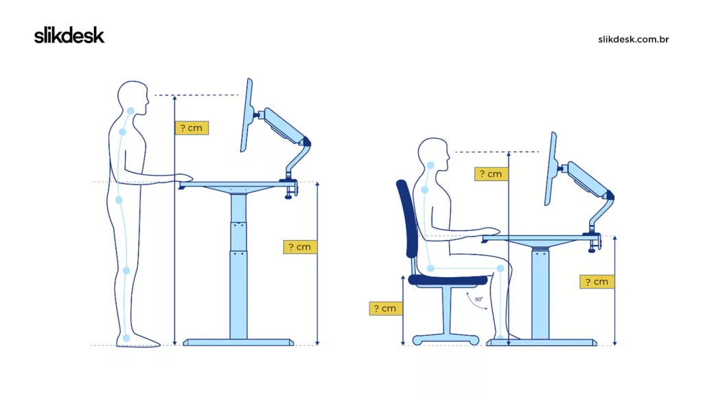 Para ambos os casos (sentado ou em pé), a Slik possui uma calculadora ergonômica gratuita responsável por indicar os parâmetros ideias de ajuste em uma mesa, conforme a altura de cada usuário.